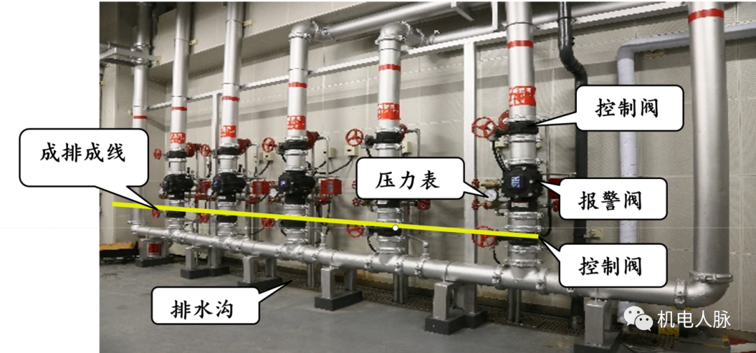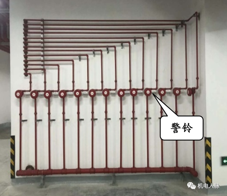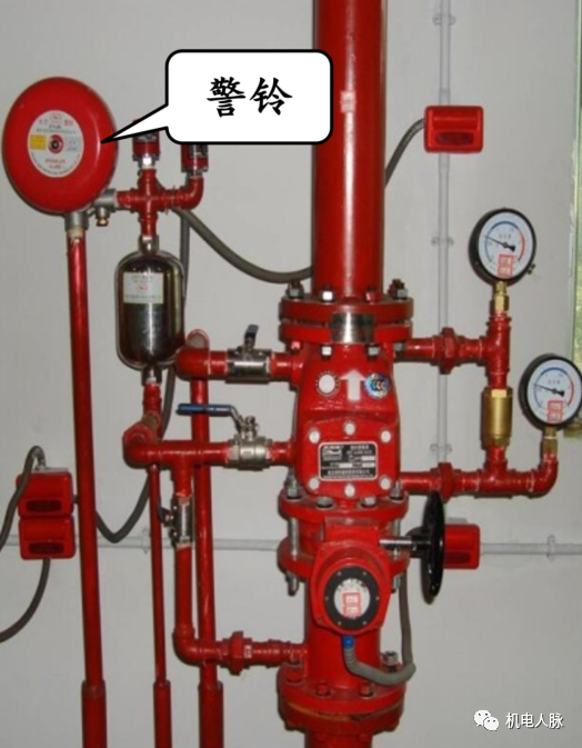 3)水力警铃:设在有人值班的地点附近或公共通道的外墙上;与报警阀连接的管道管径为20mm,长度不宜大于20m。