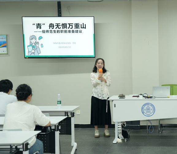 李青老师先高屋建瓴的向大家分享了她作为一线教师的一些教学工作经验,详细介绍了师范生未来30年可能的专业发展路径。邓莹莹老师则用几个实例向大家介绍了一线老师所需具备的各种能力。