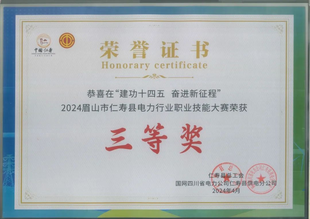 2024年4月16日,“建功十四五 奋进新征程”眉山市仁寿县电力行业职业技能大赛正式落下帷幕,本次大赛除了144名电力行业职工,还首次邀请了410名社区网格员一起参加。宏源通锦派出的三名参赛选手在比赛中齐心协力、默契配合,经过激烈角逐,最终荣获本次大赛的三等奖。