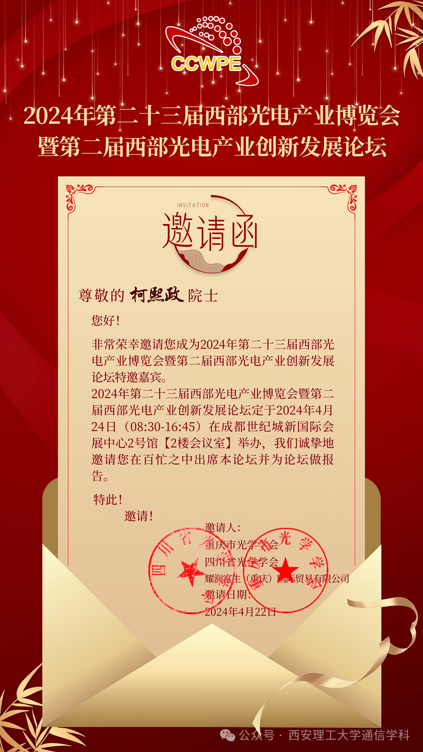 由中国光学光电子行业学会激光分会、中国兵工学会激光专业委员会、陕西省光学学会、重庆光学学会、四川省光学学会等联合主办,中国光学学会光学制造专业委员会、中国光学学会高速摄影与光子学专业委员会、云南省光学学会、贵州省光学学会、四川省电子学会、重庆市电子学会等协办,耀润富生(重庆)国际贸易有限公司承办的2024年第23届西部光电产业博览会暨西部光电产业创新发展论坛于2024年4月23日-25日在成都世纪城新国际会展中心举办。