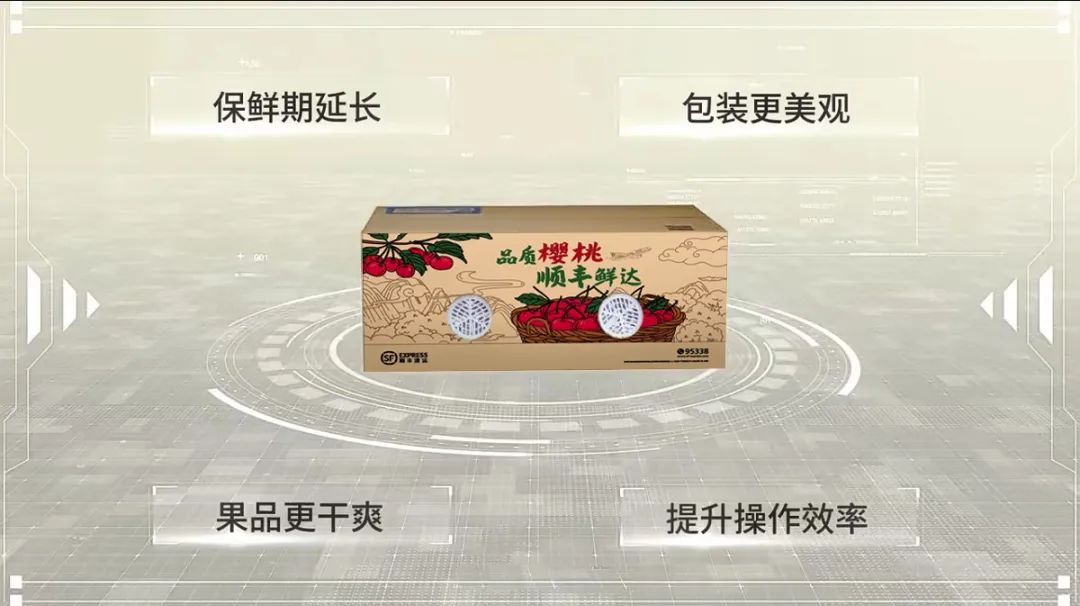针对樱桃“易烂易碎、储存条件苛刻、保存期短”等寄递难题,顺丰研发了「自发式气调保鲜箱」作为包装材料。它摒弃了传统的冰袋使用,可以自发调节箱体内樱桃周围的氧气和水分含量,从而降低樱桃的呼吸强度,可让樱桃保持新鲜长达60个小时,达到延长贮藏期和保鲜期的效果。