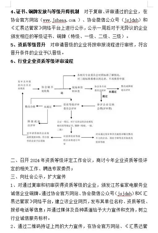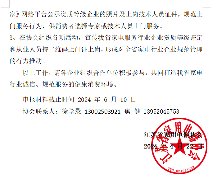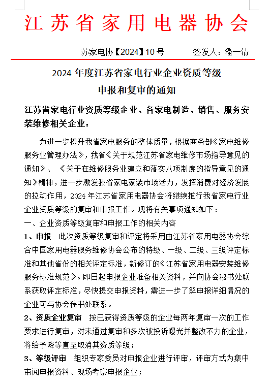 为进一步提升我省家电服务的整体质量,根据商务部《家电维修服务业管理办法》,我省《关于规范江苏省家电维修市场指导意见的通知》、 《关于在维修服务业建立和落实八项制度的指导意见的通知》精神,进一步激发我省家电家装市场活力,发挥消费对经济发展的拉动作用,2024年江苏省家用电器协会将继续推行我省家电行业企业资质等级的复审和申报工作。