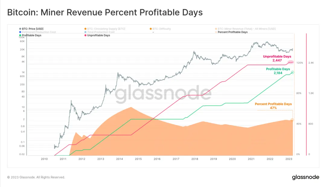 根据 Glassnode 在 3 月 24 日的报告,自 2010 年以来,矿工已经经历了长时间的不盈利时期,只有 47% 的交易日是盈利的。