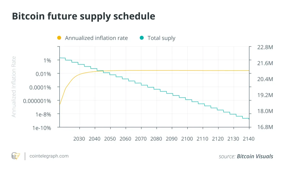 根据 Hansen 的说法,根据区块的发现速率和每四年(或每 210,000 个交易区块)大约发生一次的减半过程,最后一个比特币最有可能在 2140 年左右被挖掘出来。