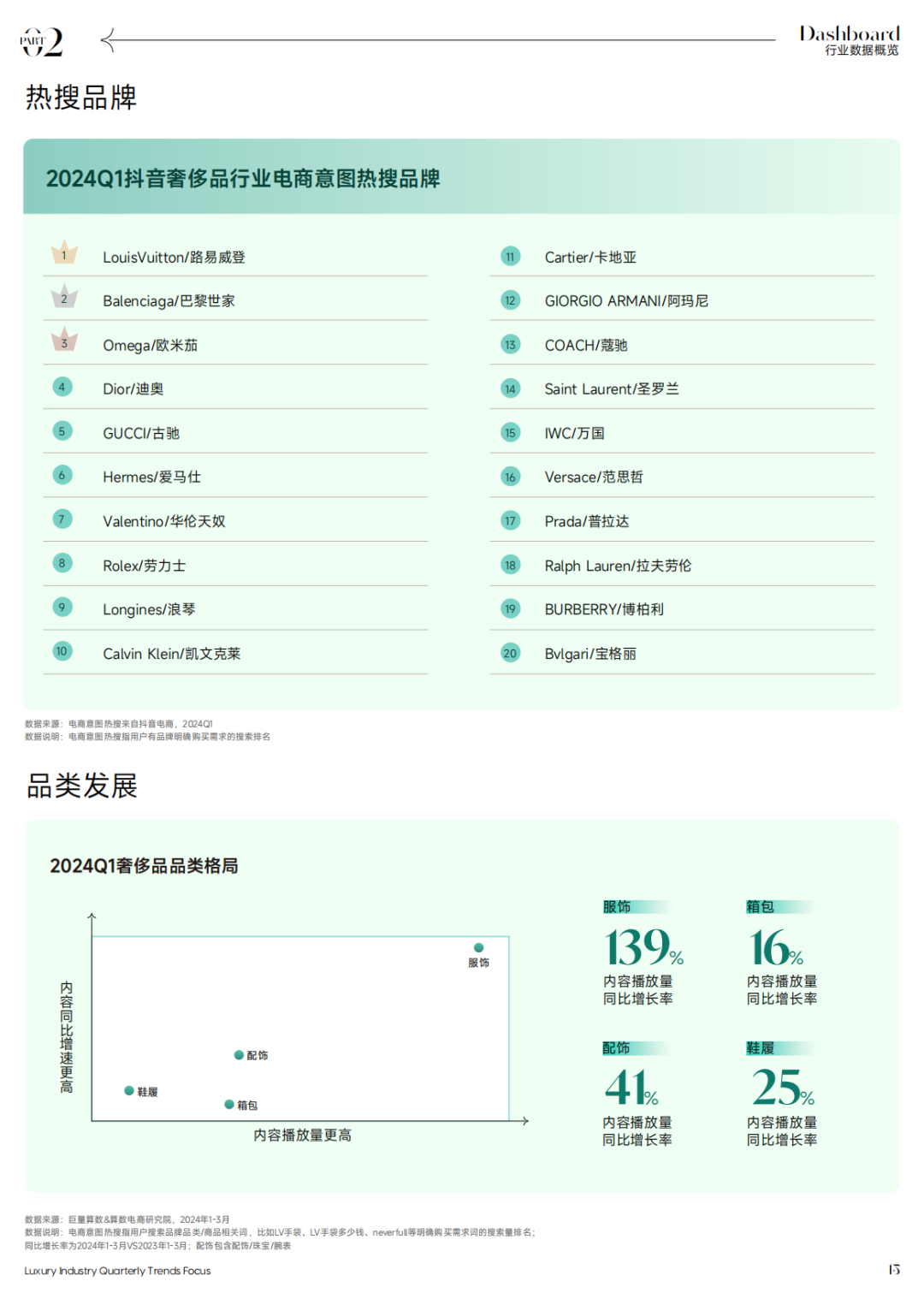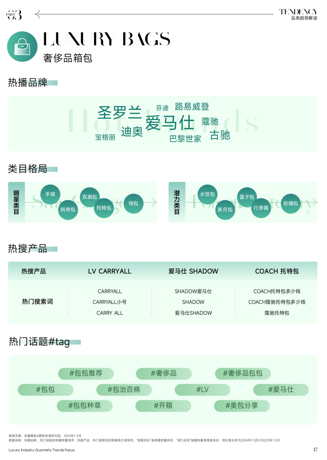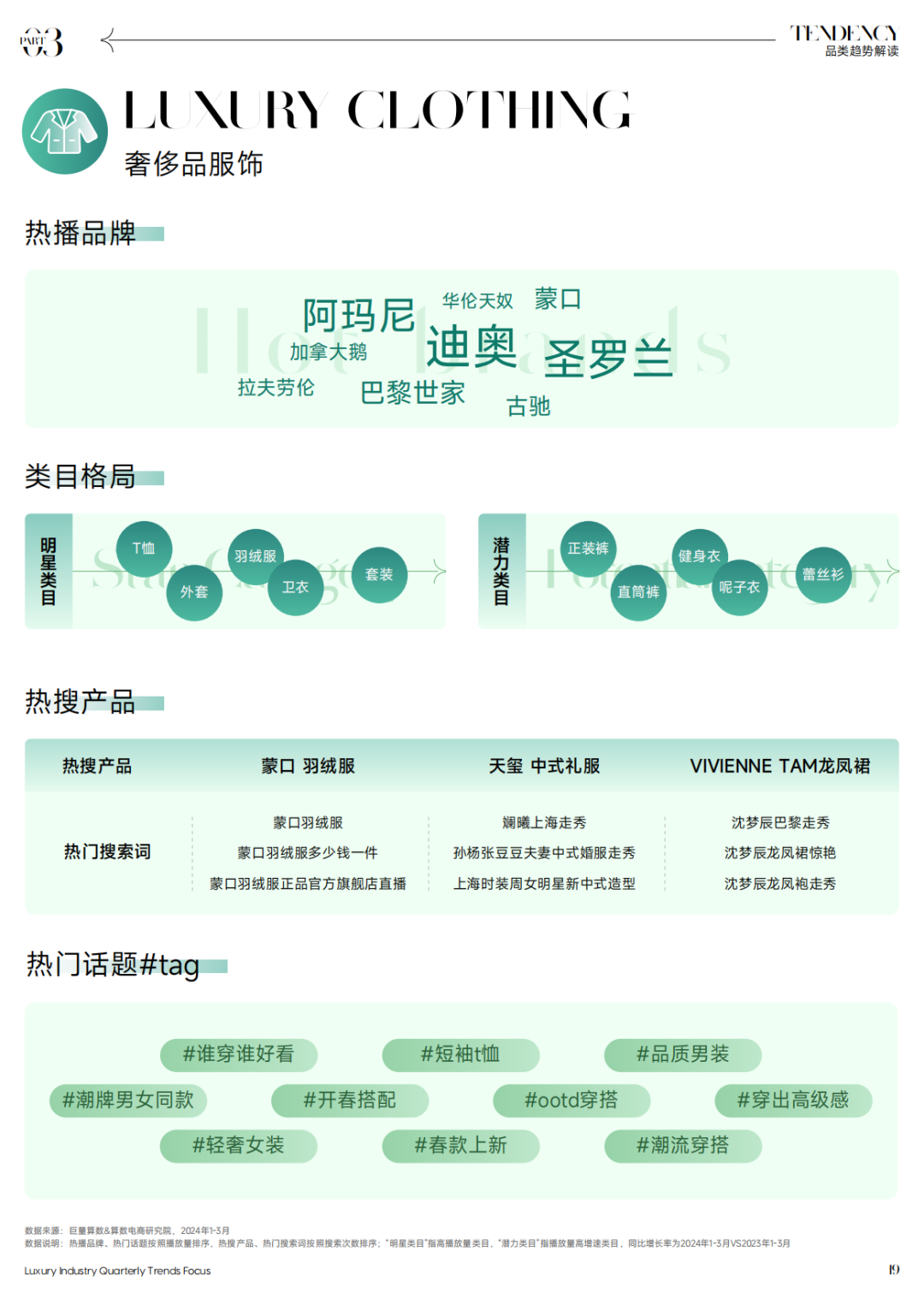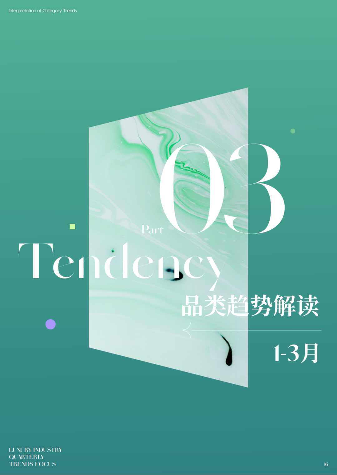 品类趋势解读 Tendency:分析了奢侈品箱包、服饰、配饰和鞋履的品类趋势,包括热播品牌、明星类目和潜力类目。