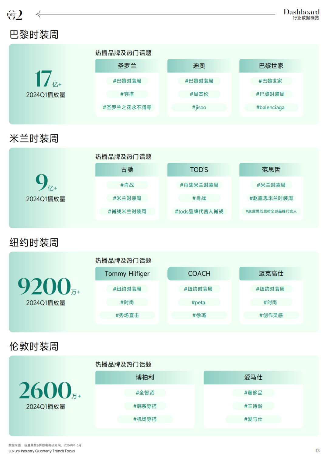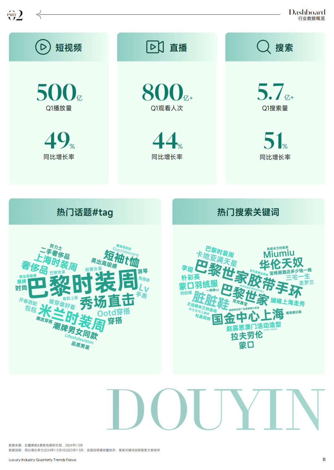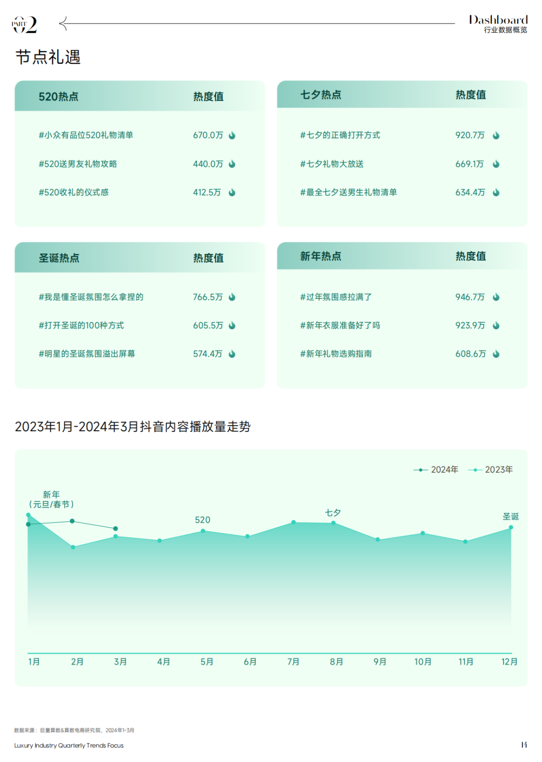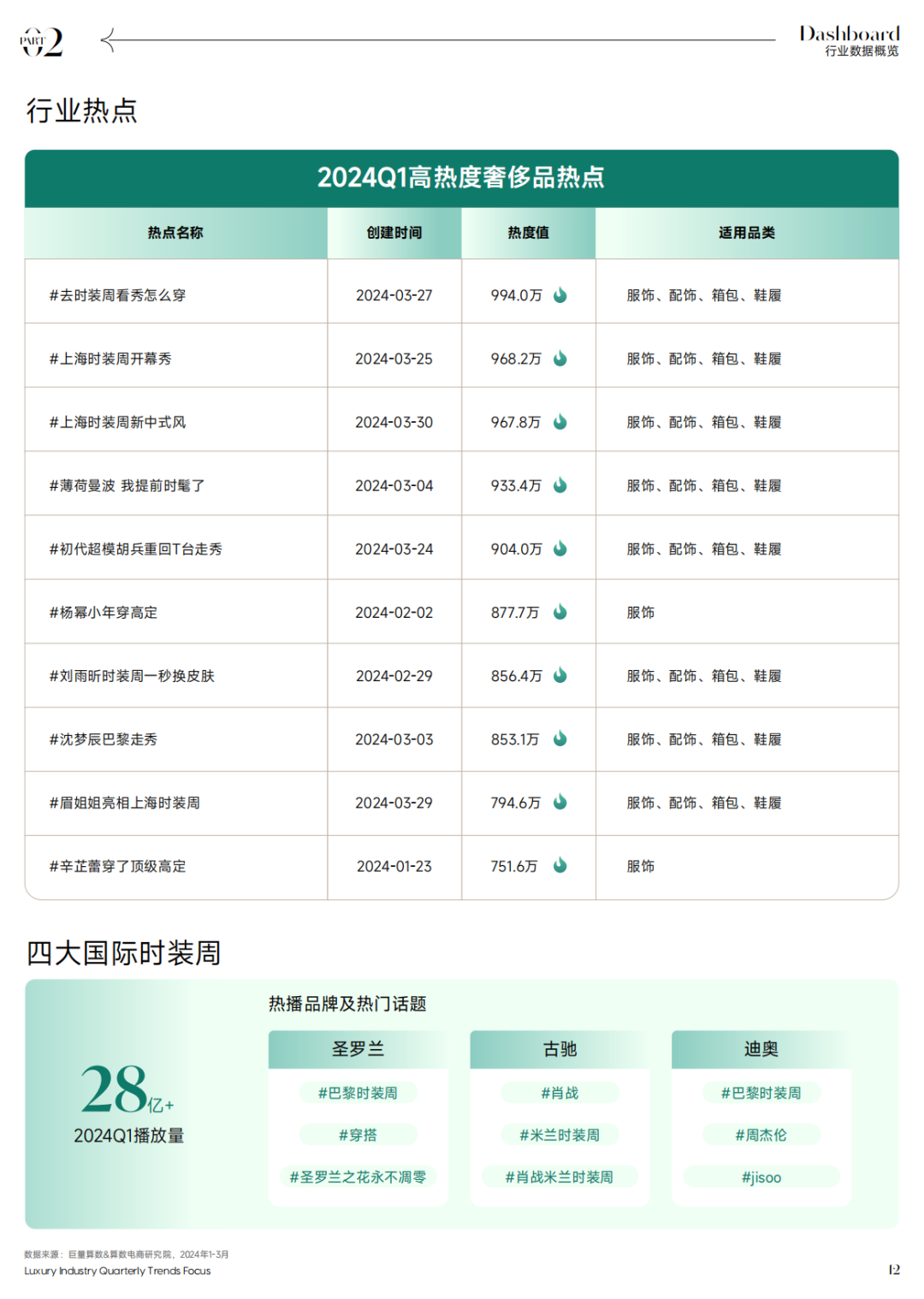 品类趋势解读 Tendency:分析了奢侈品箱包、服饰、配饰和鞋履的品类趋势,包括热播品牌、明星类目和潜力类目。