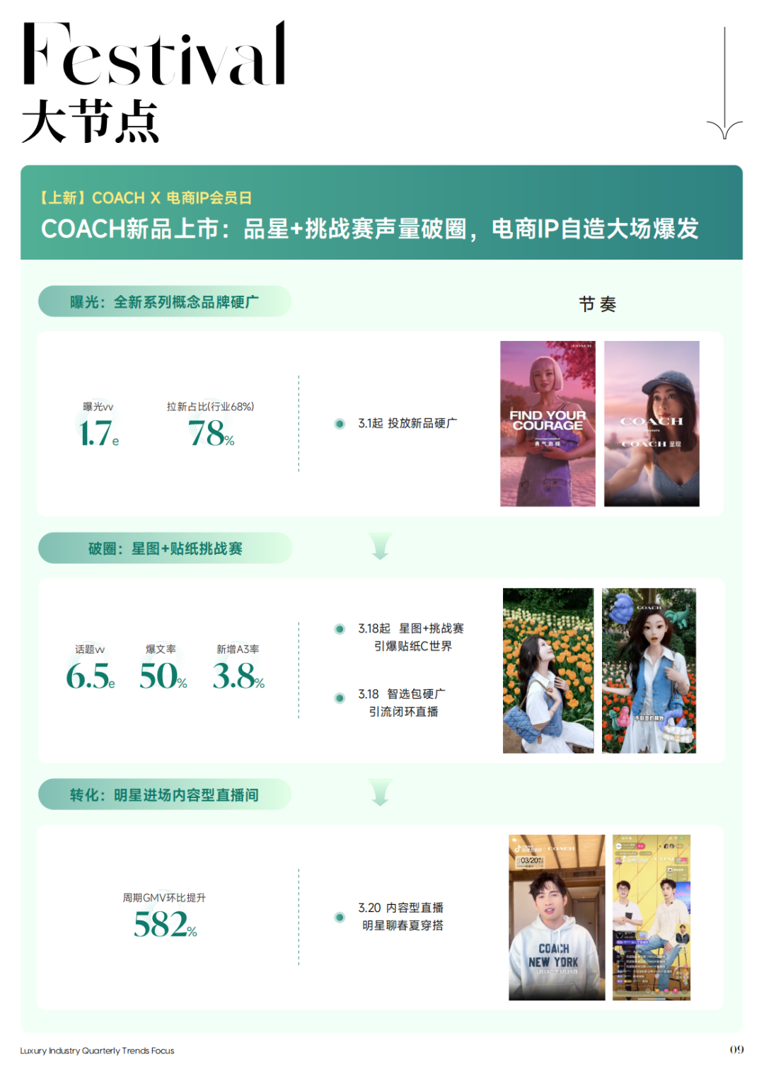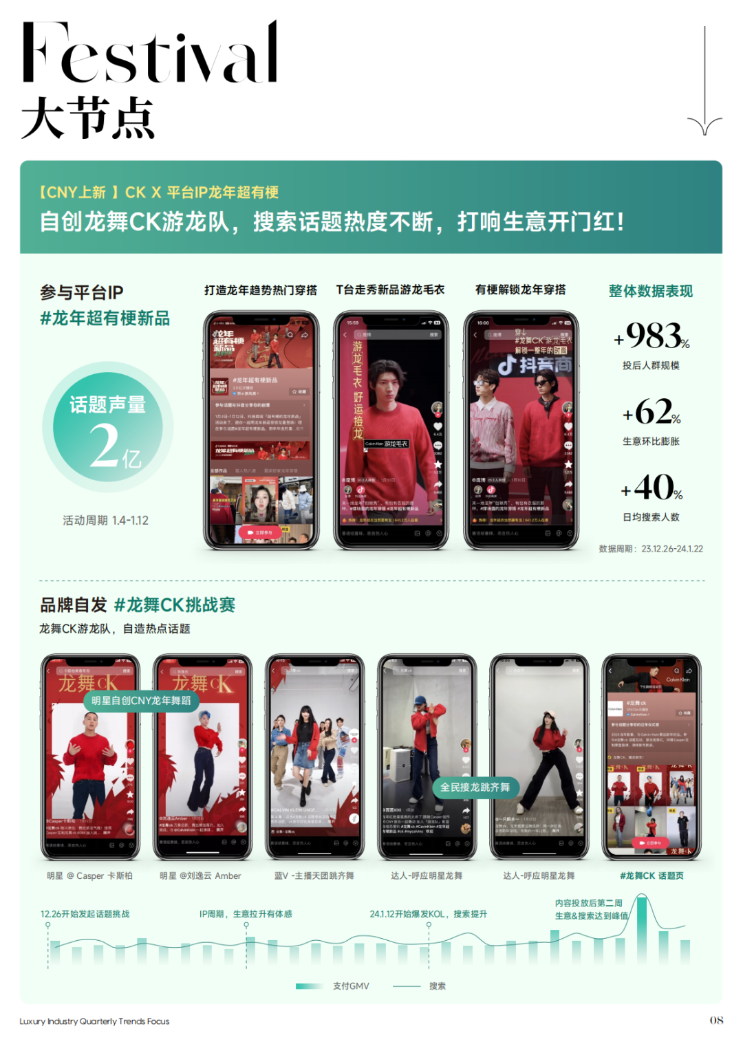 大节点 Festival:CK X 平台IP龙年超有梗活动,通过挑战赛和明星参与,提升了生意环比。