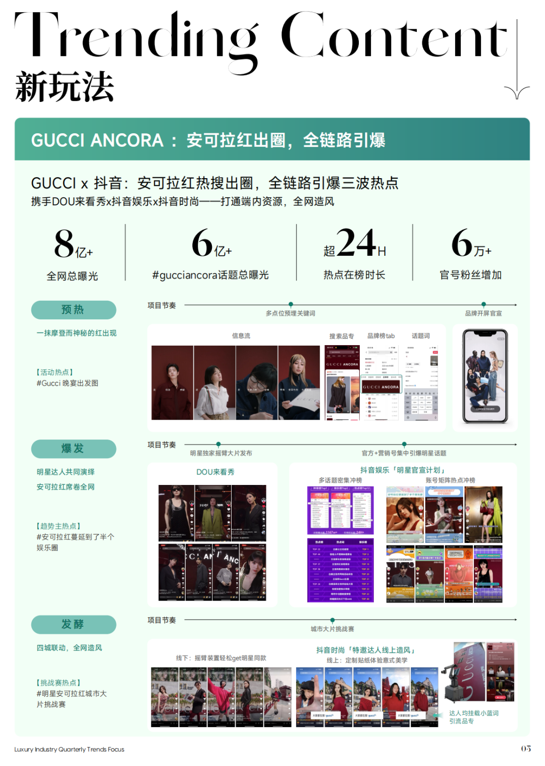 新玩法 Trending Content:GUCCI ANCORA 红出圈活动通过全链路引爆,实现了全网总曝光8亿+。