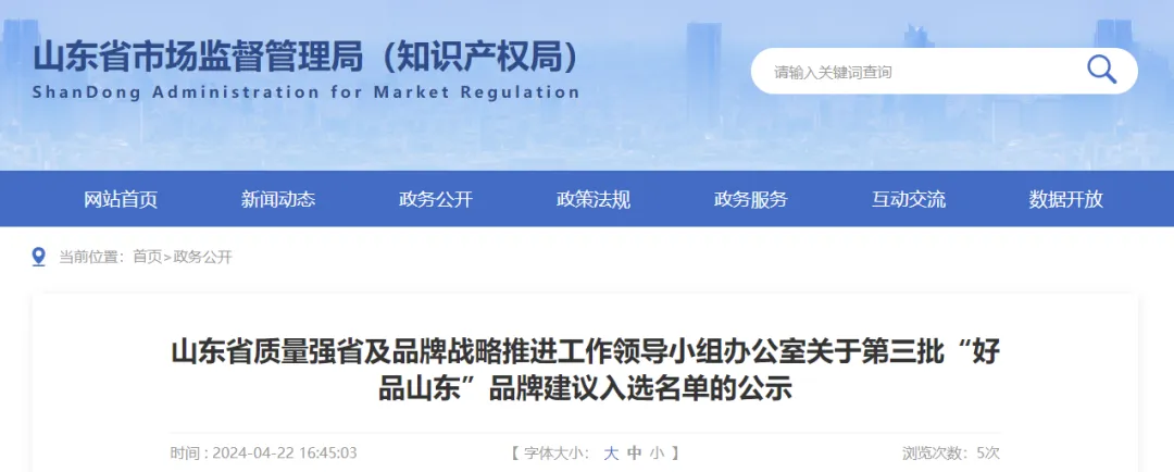 山东省质量强省及品牌战略推进工作领导小组办公室关于第三批“好品山东”品牌建议入选名单的公示