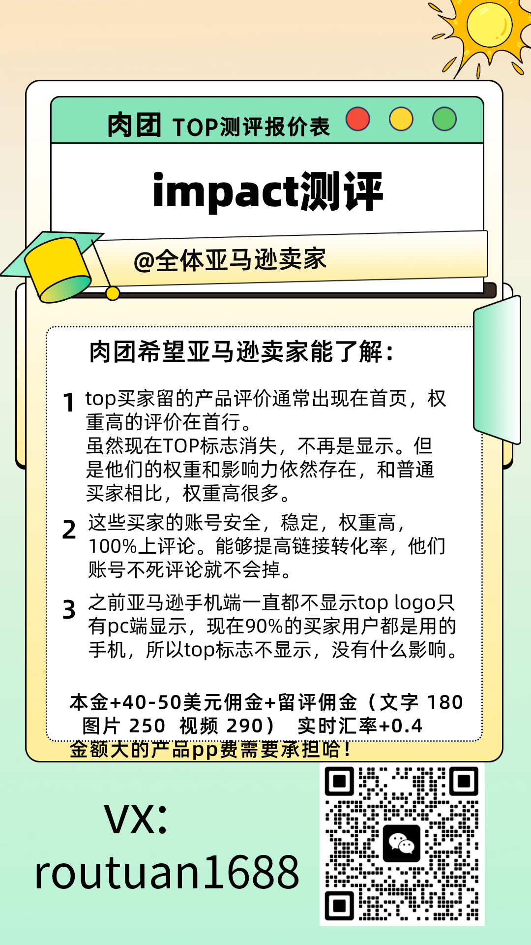 | TOP测评 | 美国,欧洲 | 15-30天 | Impact买家为原Top测评人在亚马逊属于拥有较高权重的买家群体,他们的评论拥有安全稳定的特性,但是对产品比较挑剔。 | |