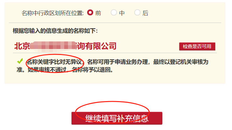如果名称检查通过,点击:继续填写补充信息