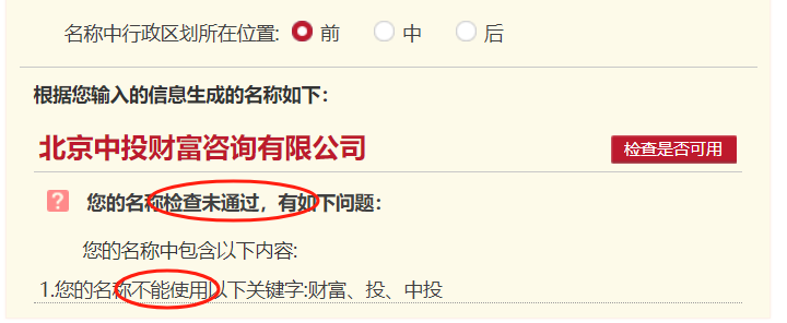 提醒:名称检查不通过,不能使用相关字号