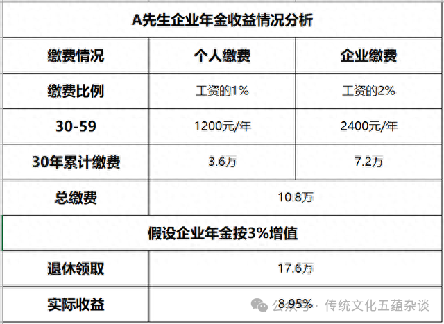 如图所示,假设企业年金每年增值3%,直至退休。那么A 先生在退休前只缴了3.6万,但是60岁退休时却可以领取17.6万,平均每年的收益率达到8.95%!