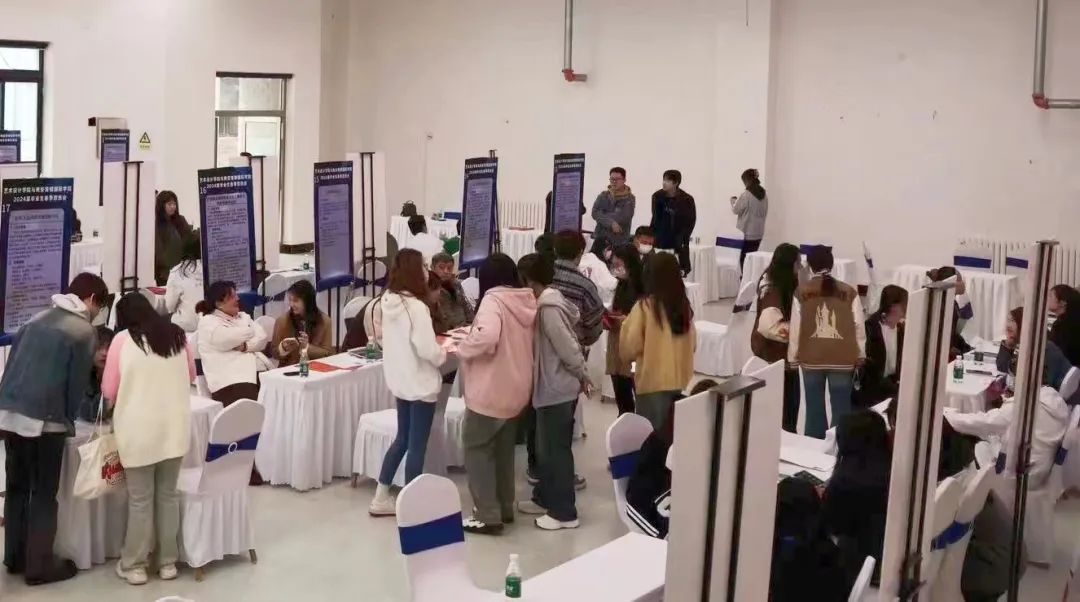 招聘现场,求职学生纷纷与企业沟通交流,用人单位了解学生的求职方向与就业想法,根据招聘需求向学生介绍岗位情况,有的学生在现场与企业达成招聘意向,有的互相留下联系方式,以便进一步沟通协商。