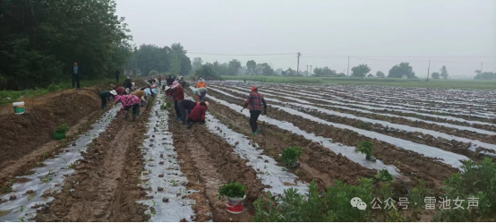 一起铺膜、打洞、栽苗、培土、浇水,井然有序,大家都拿出了看家本领,用了一上午的时间结束