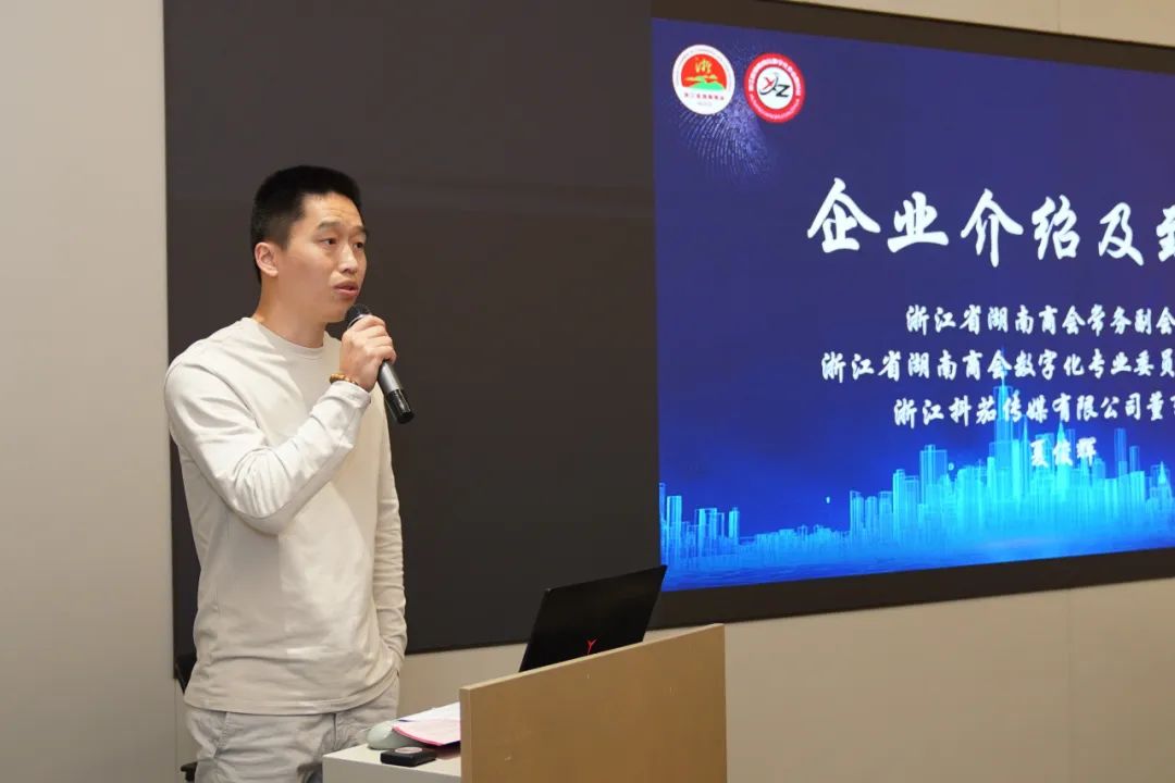 浙江抖茄传媒有限公司董事长夏俊辉代表主办方--杭州湖南商会、浙江省湖南商会数字化委员会、杭州娄底商会(筹)及承办方“浙江抖茄传媒有限公司”致辞。