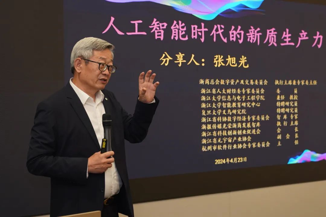 张旭光教授为大家开设了《人工智能时代的新质生产力》主题课程,现场2小时的分享,深入解读了人工智能时代下的政策背景、技术发展轨迹、广泛应用场景以及未来展望。他详尽地介绍了当前先进的人工智能软件,比如AIGC、OPEN AI的chatGPT、通义千问、华为昇腾AI、科大讯飞等,这些前沿技术为企业提供了宝贵的人工智能视角,助力他们在创新道路上迈出坚实的步伐。张教授还就如何把握人工智能时代下的“美丽经济”发展机会提出了深刻的见解与建议。技术创新与应用层出不穷,未来的竞争,也许就是懂不懂AI的竞争,会不会利用AI的竞争!