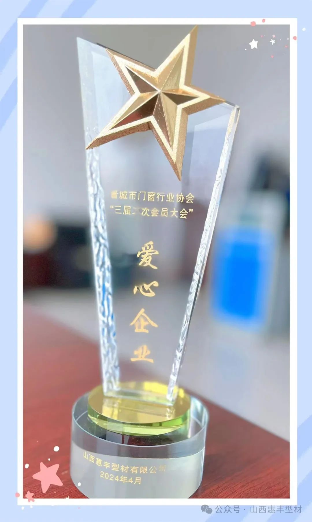 近日,晋城市门窗行业协会三届二次会员大会圆满举行。山西惠丰型材有限公司受邀参加,并被晋城市门窗行业协会授予2023年度“优秀供应商”、“爱心企业”荣誉。