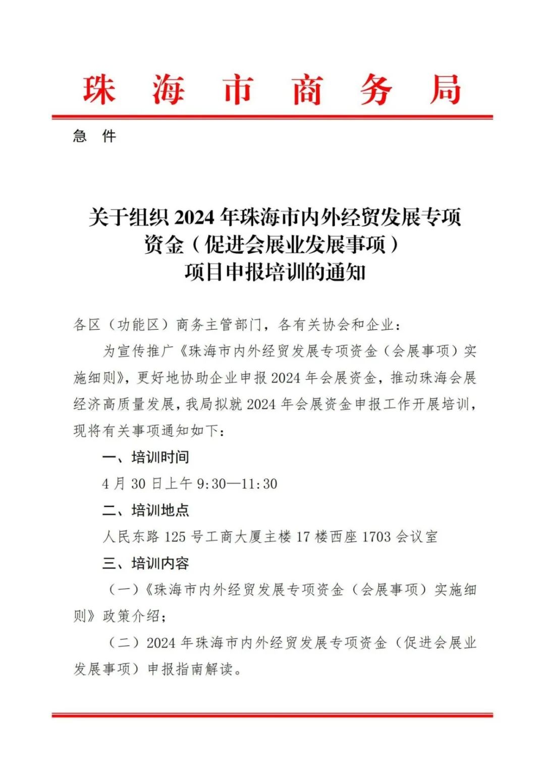 通知 | 关于印发2024年珠海市内外经贸发展专项资金(促进会展业发展事项)申报指南的通知
