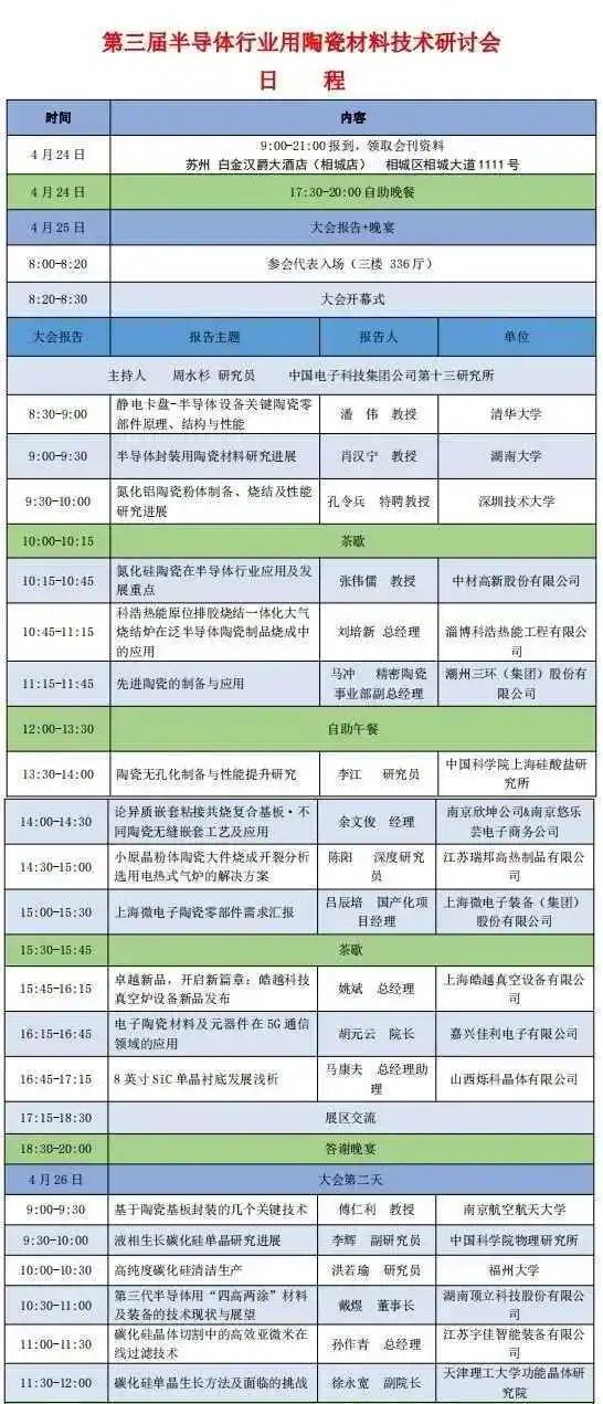 本届会议主要议题涉及电子陶瓷材料、半导体封装用陶瓷材料、碳化硅、氮化硅及氮化铝陶瓷在半导体行业的应用、先进陶瓷的制备与应用等议题。