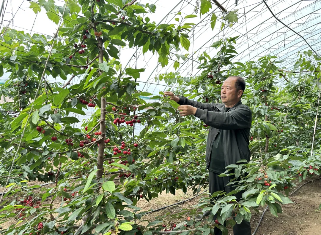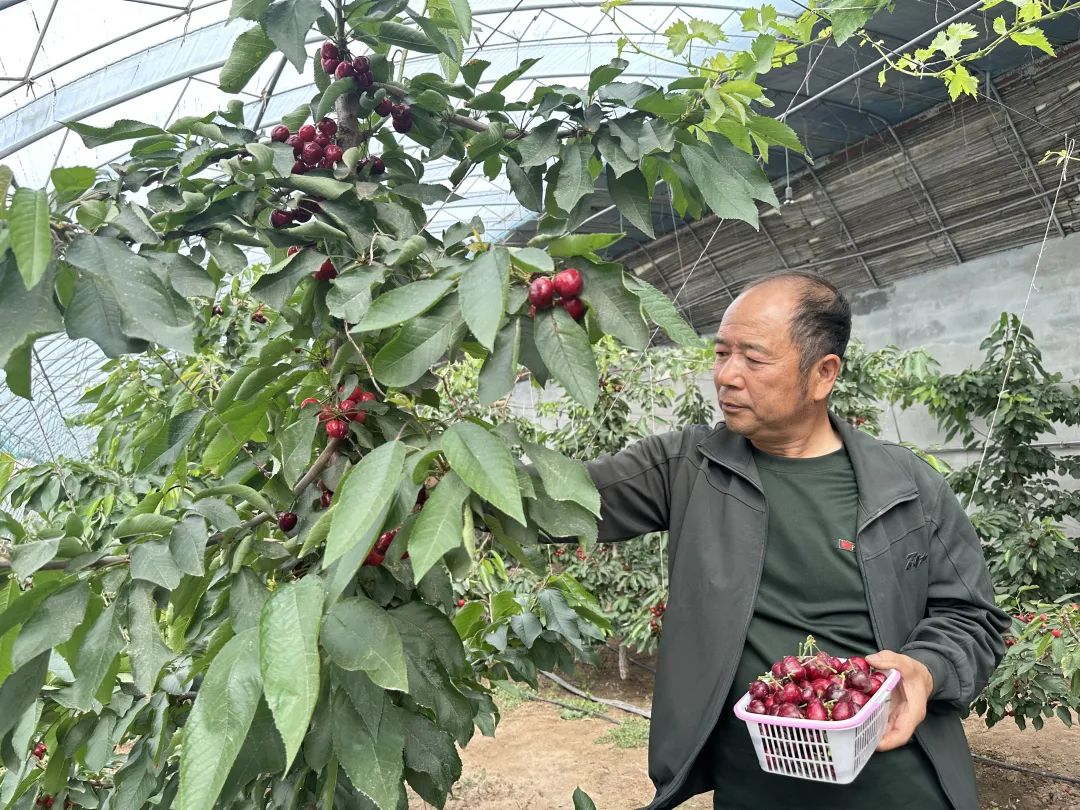 3年前,骆全文尝试在自家大棚里种植了3亩美早车厘子,这种水果喜阴,对于温度、湿度、光照及水分更是有很高的要求,而且三年才能挂果,这让很多种植户都望而却步。从没有种植经验的骆全文却迈出了第一步,进行示范种植,他从甘肃引进了优质的品种,自己摸索、学习,经过精心的养护,今年4月中旬,车厘子陆续成熟,预计产量近2000斤,采摘期可以从现在持续至5月中旬,根据品种和大小,每斤车厘子能卖到100元左右。