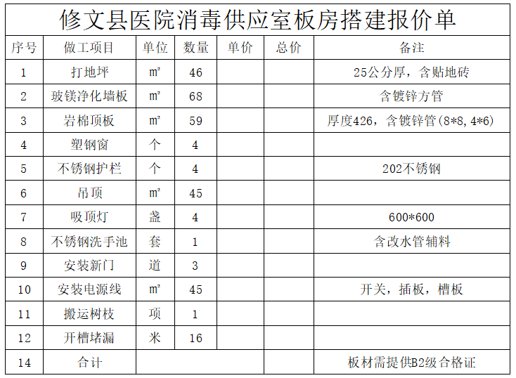 三、项目名称:修文县人民医院消毒供应室搭建板房