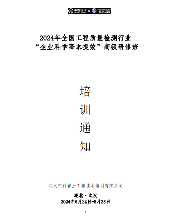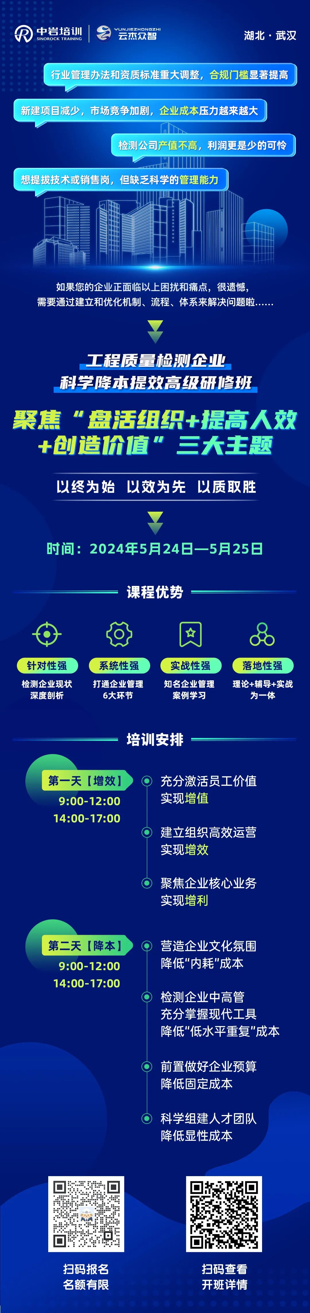 中岩培训联合云杰众智一线知名管理专家,特定于2024年5月在湖北·武汉举办“全国工程质量检测行业企业科学降本提效高级研修班”。
