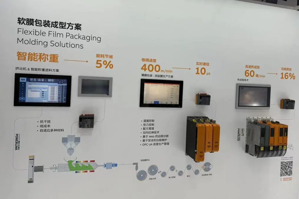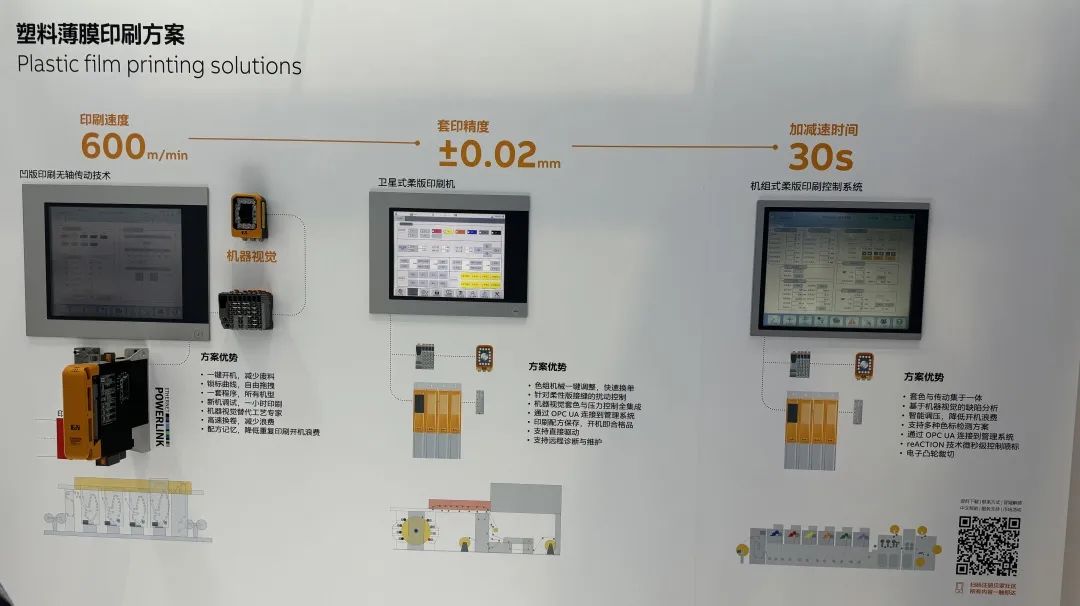 同期,贝加莱还展出了热成型包装,以及薄膜印刷解决方案。分别展示了贝加莱在软膜生产中的称重、温度、张力的精准控制,以及适配短印数要求的凹版印刷无轴传动和机组式柔板、卫星式柔版的控制系统,包括基于振动的预测性维护技术也进一步增强了印刷机方案的智能化能力。