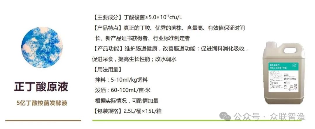 正丁酸原液采用饲添字,丁酸梭菌单位含量≥5.0×1011cfu/L,活菌含量高,使用后更易在水环境或肠道内定植,形成优势菌群快速生长。
