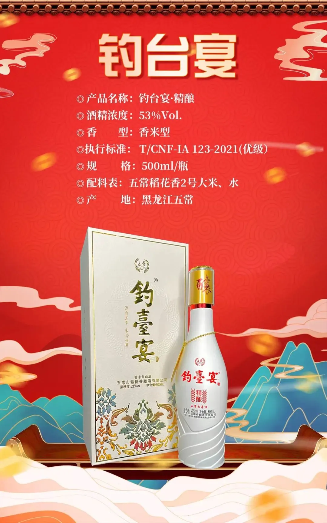 “钓台宴”是独创的香米型白酒。它采用五常稻花香2号大米为主要原料,通过老池发酵、精心洞藏,打造出独树一帜的中高端白酒品牌。