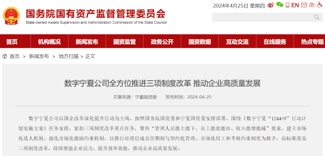 【编者按】近日,国务院国资委官方网站刊登了数字宁夏公司深入推进三项制度改革的典型案例。文章介绍了我公司在建立市场化选人用人机制、强化市场化激励约束机制,以及推行经理层成员任期制与契约化管理、市场化用工和考核约束制度等方面的改革举措和实践探索。下一步,数字宁夏公司将以新一轮国企改革深化提升行动为主线,以构建新型经营责任制为目标,按照自治区党委、政府的安排部署,在自治区国资委的指导支持下,高标准落实三项制度改革,持续增强企业活力,推动企业高质量发展。