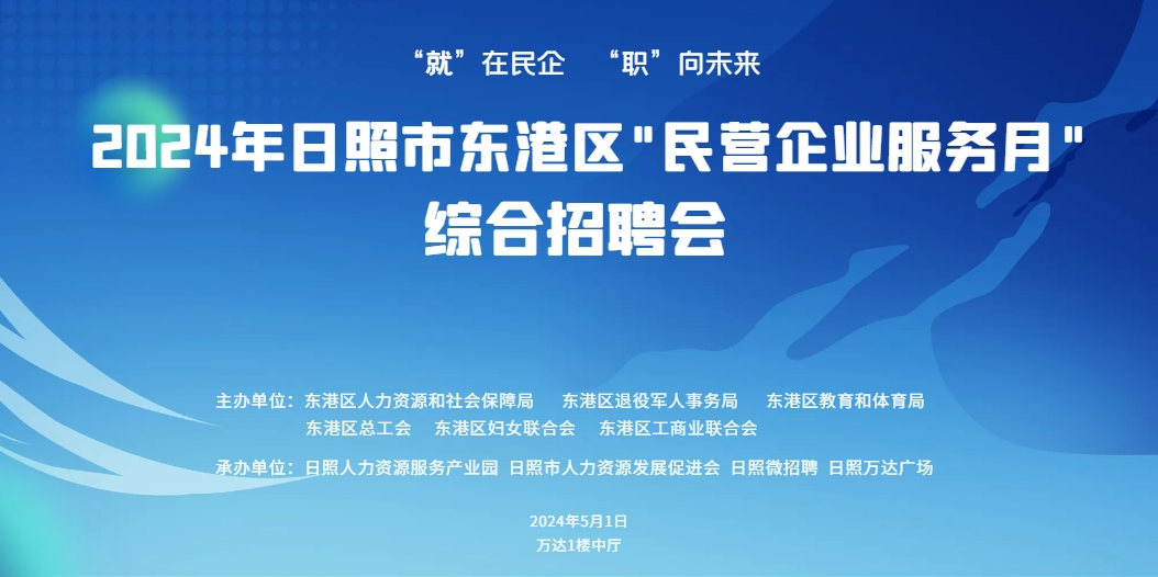 为深入贯彻党的二十大精神,落实党中央、国务院稳预期稳增长稳就业决策部署和“两个毫不动摇”方针,促进民营经济高质量发展,多点发力稳就业促增收。东港区拟于5月1日组织举办“就在民企·职向未来”2024年日照市东港区“民营企业服务月”综合招聘会,全力稳就业、保用工、促发展。具体内容如下: