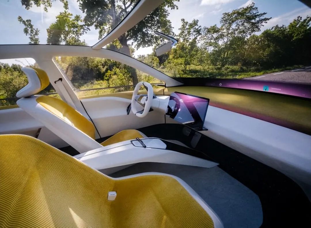 在车内大量采用了再生材料和织物材料,同时车内格调精致时尚。包裹座舱的双色织物均由再生聚酯纤维制成,包括弧形仪表板、车门等,座椅表层采用织物表面或打孔的Vescin素皮材料,图案精致手感细腻,既环保又营造出温馨而豪华的车内氛围。