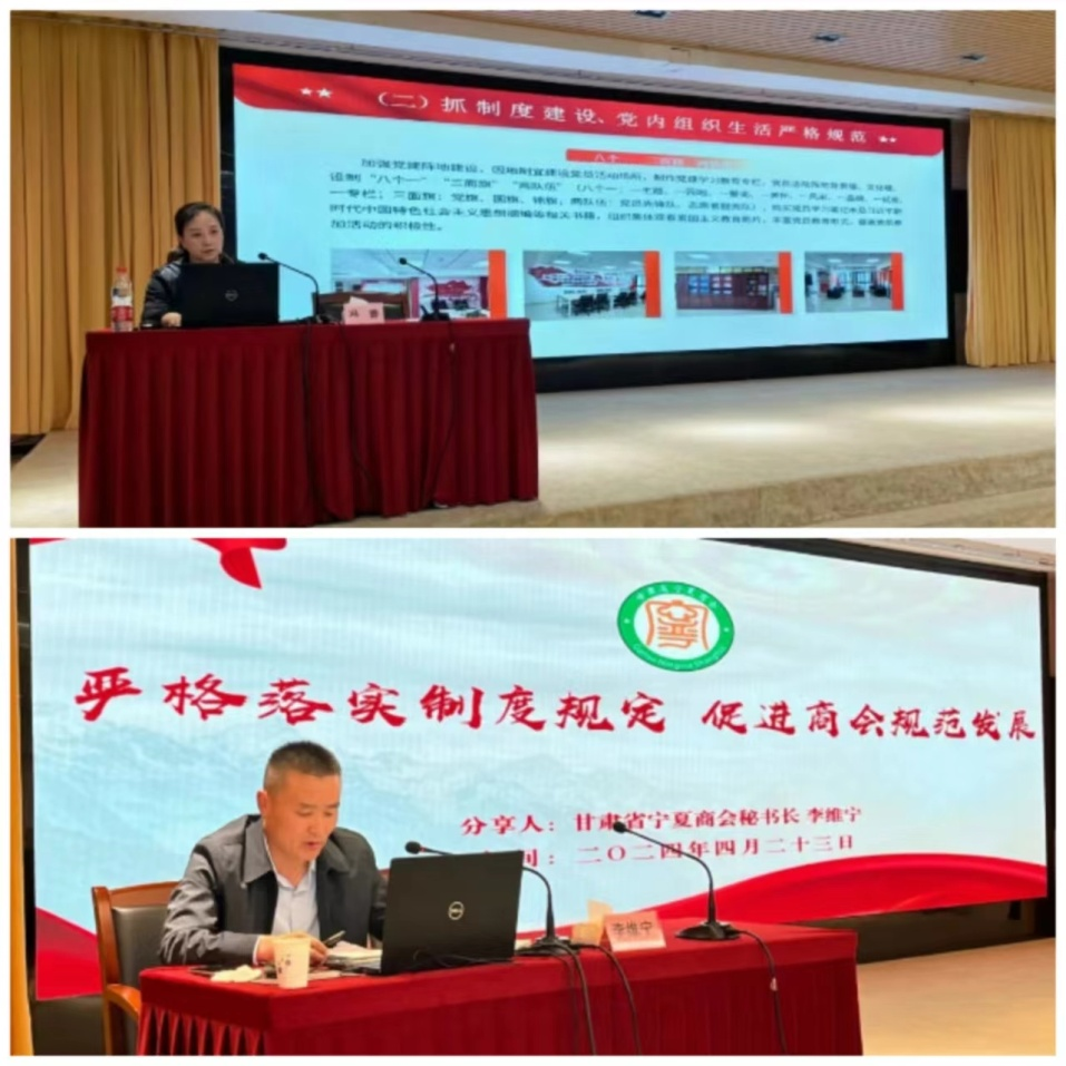 甘肃省陕西商会党委副书记、秘书长冯蕾围绕“坚持党建领航 推动健康发展”主题、甘肃省宁夏商会秘书长李维宁围绕“严格落实制度规定 促进商会规范发展”主题作了商会工作经验分享。