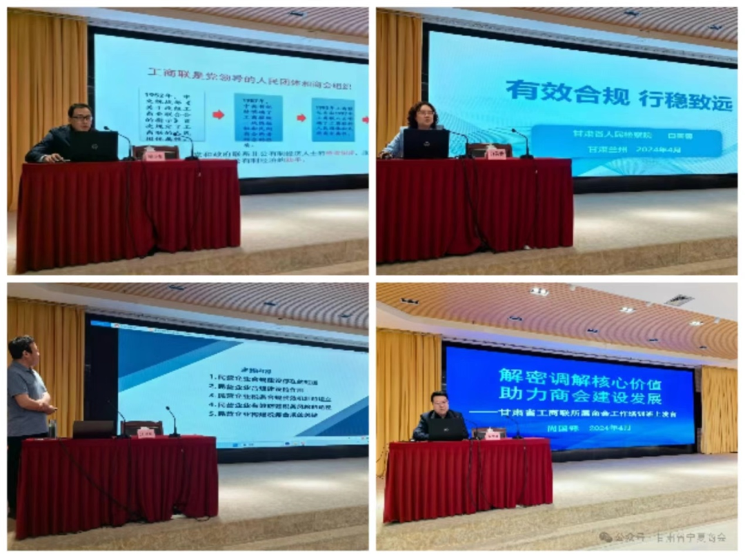 全国工商联组织建设部商会处副处长程小东围绕“关于推动工商联所属商会改革发展”主题作辅导授课。甘肃省检察院第四监察部主任白芙蓉围绕“有效合规 行稳致远”主题作涉案企业合规第三方监督评估工作专项辅导。甘肃贵勤税务师事务所所长汪卫东围绕“民营企业税务合规及税收风险防范”作涉案企业合规第三方监督评估工作案例分析。兰州市法云维权人民调解中心主任尚国锋代表中心围绕“解密调解核心价值 助力商会建设发展”主题作商会人民调解工作经验分享。