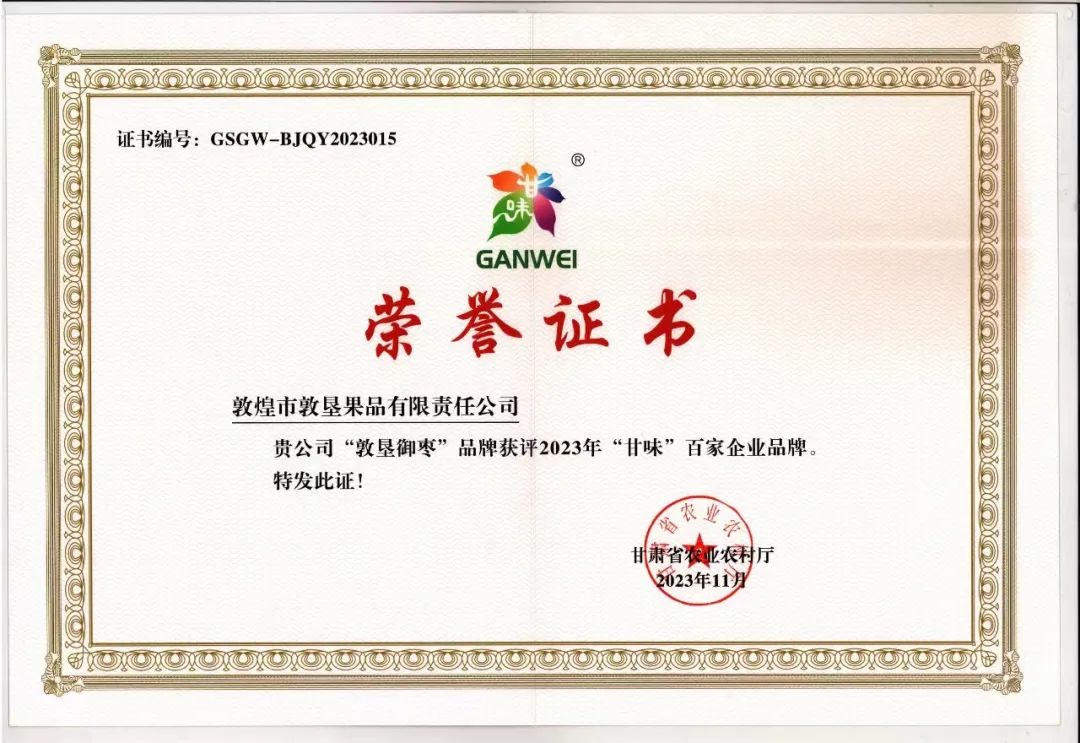 突出质量为先,不断加强品牌建设。在推动产品种类多元化的同时,逐步提高管理水平,目前公司已通过ISO9001质量管理体系认证、两化融合管理体系认证,建立了红枣产品全程可追溯系统。产品“敦垦御枣”“敦煌骏枣”取得绿色食品认证,并连续多次获绿色食品博览会金奖,“敦垦御枣”首批入选“甘味”企业商标品牌,被评为“酒泉市十大农产品品牌”、2023年“甘味”百家企业品牌。同时,敦垦果品公司被敦煌市政府评为“2022年度强科技先进单位”“2023年度农产品品牌建设与销售先进单位”、2023年酒泉市“十大农业产业化龙头企业”。