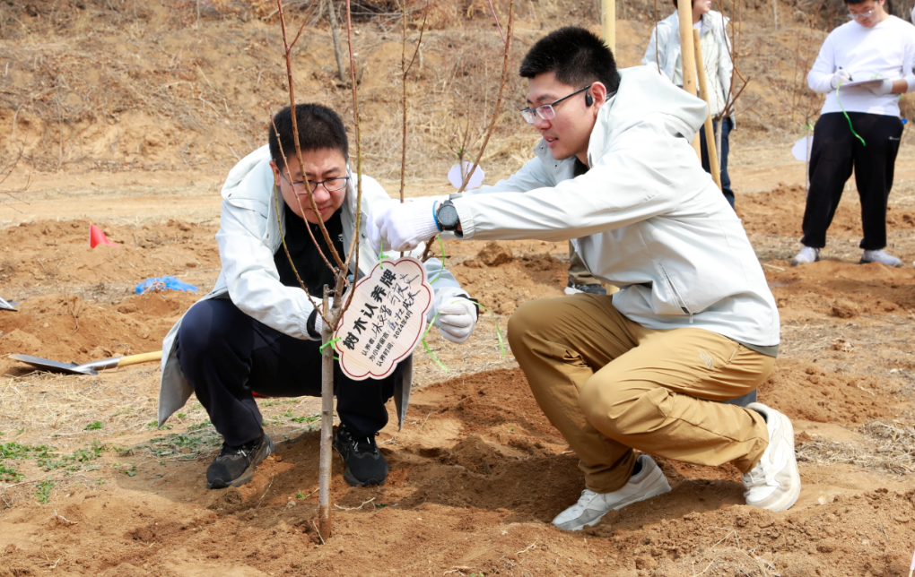 经过短暂的休息调整,大家全情投入到义务植树活动中。在专业人员指导下,大家认真学习了树苗栽种方法和注意事项,各自分工协作,挥锨铲土、扶苗填土、提桶浇水……大家干劲十足,齐心协力种植的120株树苗迎风挺立,员工们在每棵树苗挂上寄语牌,写上自己对祖国和公司的美好祝福。