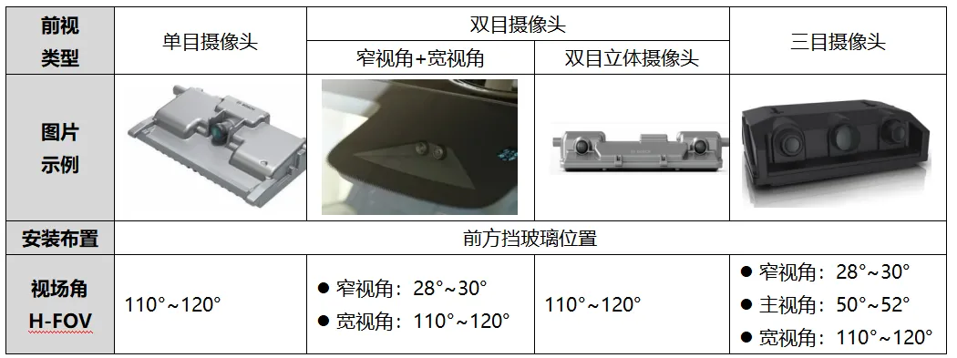 前视摄像头分辨率通常在2~8MP ,一般布置在前风挡位置。根据镜头个数的不同,前视摄像头又可分为:单目摄像头、双目摄像以及三目摄像头。