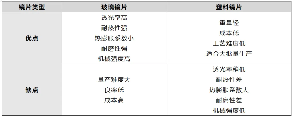 玻璃镜片具有透光率高、耐热和耐磨性强等优点,但成本较高,且量产难度大。