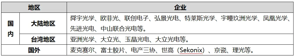 国内:舜宇光学、欧菲光、联创电子、晶华光学、宇瞳光学、富兰光学、蓝思旺、瑞丰光电、中润光学、三景科技、瑞鼎光电、蓝思光电、新旭光学、宁波峰梅等。