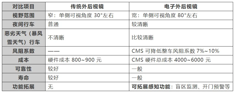 CMS(电子外后视镜)是一套基于摄像头和显示屏的组合装置来替代传统外后视镜。通过外部摄像头采集图像信息,经过数据处理后,将车辆侧后方的信息显示在座舱内的显示屏上。另外,摄像头还可兼顾侧后方的感知功能,比如盲区监测、障碍物提示等。