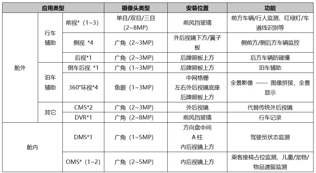 车载摄像头的应用场景可分两大类:舱外应用和舱内应用。舱外应用包括泊车辅助、行车辅助、CMS、DVR等应用;舱内应用包括DMS、OMS等应用。
