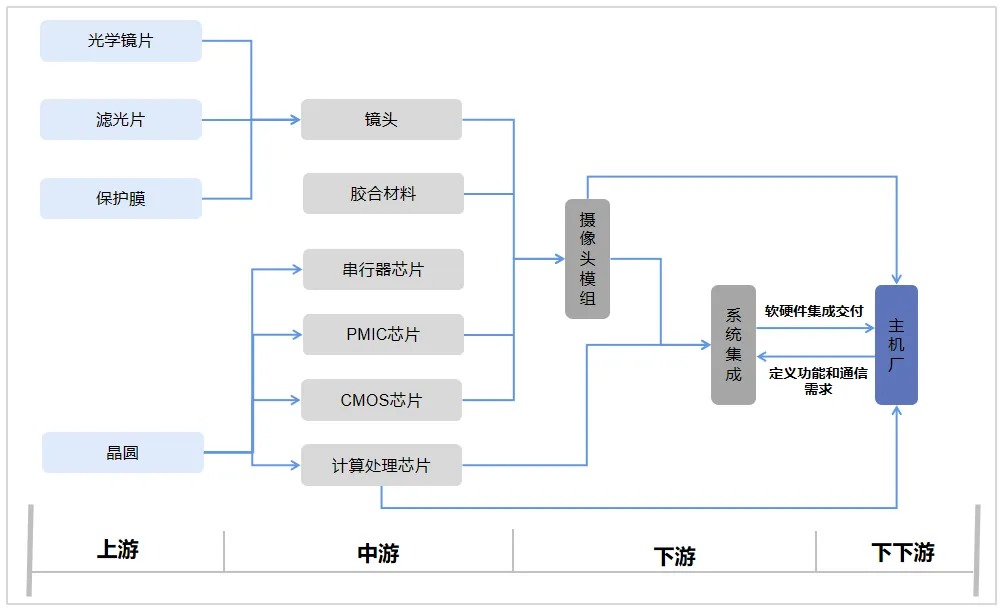 中游:镜头、胶合材料、串行器芯片、PMIC芯片、CMOS芯片、计算处理芯片等厂商