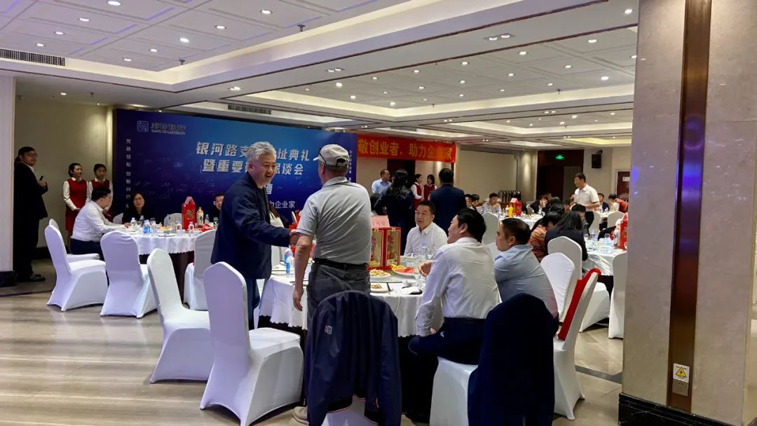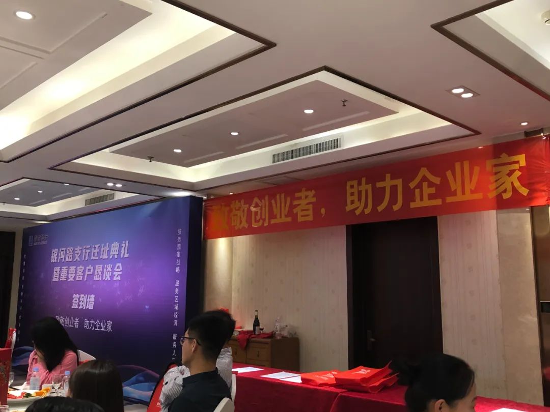 活动现场有关领导为乔迁庆典进行了雄狮点睛并揭牌。剪彩仪式后,苏晓涛会长等一行参观了新办公址,对支行新址厅堂宽敞明亮,功能分区布局合理、设计科学--集排队和智能引导功能于一体的迎宾区、具有多台智能设备的自助银行区、舒适的客户等候区、安全的现金区、便捷的非现金区、私密的VIP贵宾区、专业的理财区等办公环境给予充分赞赏。餐叙交流环节,以“致敬创业者,助力企业家”为主题,进行了金融产品的推介。商会为银河支行的乔迁赠送了花篮,以示祝贺。