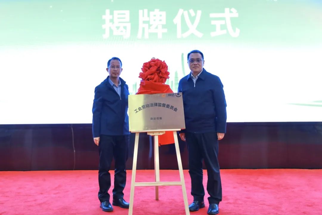 启动仪式上,上海市总工会党组成员、副主席赵德关,全国总工会韵达蹲点组组长、中国国防邮电工会邮政工作部部长郑又豪为“工会劳动法律监督委员会”揭牌。