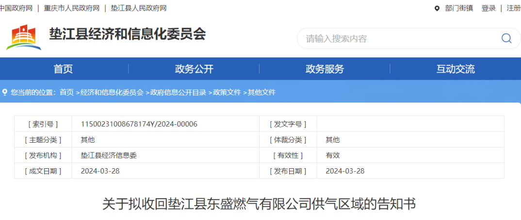 日前,重庆垫江县经信委员发布公告,拟收回垫江县某燃气公司的供气区域,主要理由为该公司未取得天然气经营许可证,也无持续稳定上游供气气源,无法满足恢复供气的条件,导致供气区域内居民供气目的无法实现,损害了社会公共利益。