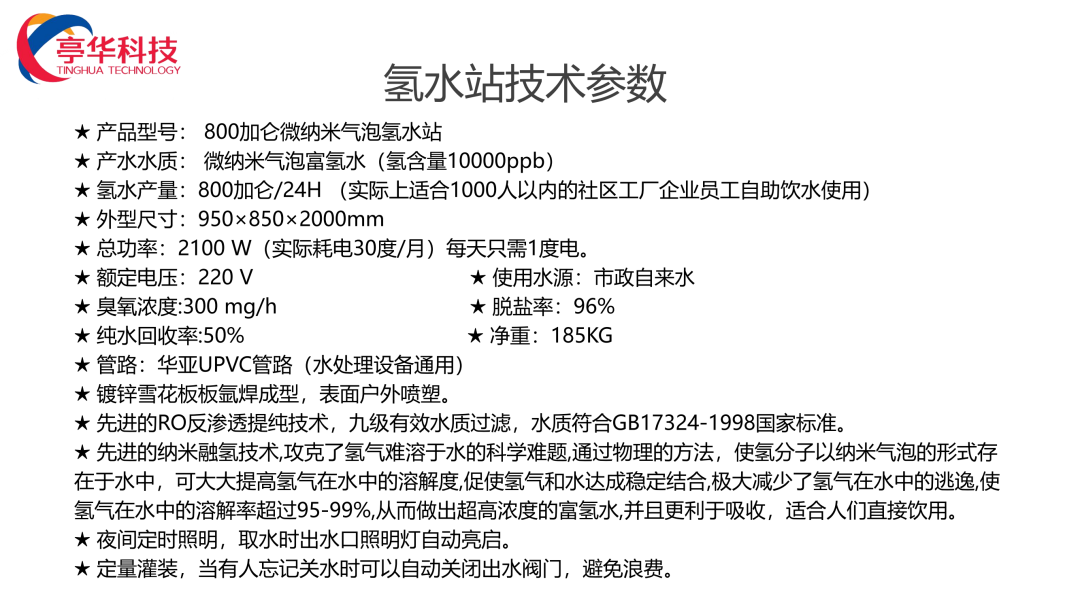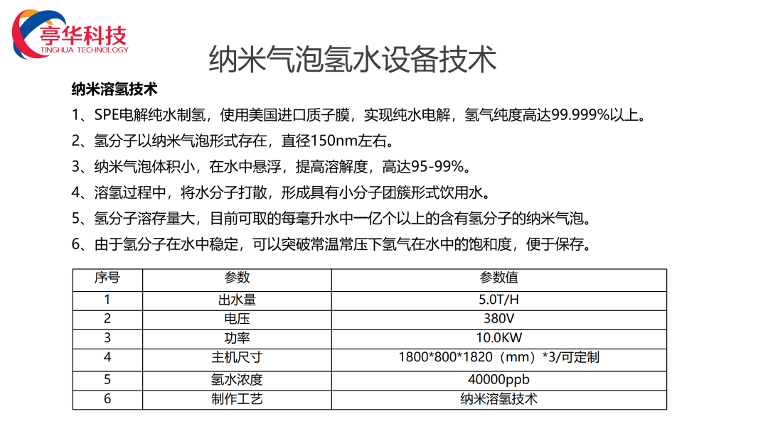 高纯度氢分子纳米融氢,安全卫生,氢含量大于40000ppb/L,每毫升水里有1.76亿个150纳米左右的氢气泡,不易挥发,储存时间,普通水桶灌装。