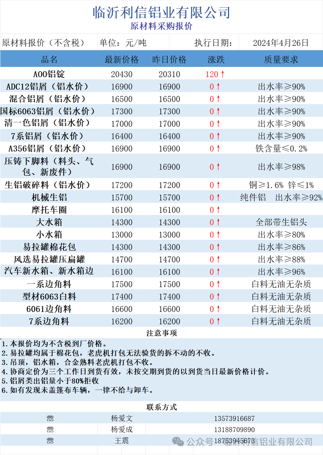 临沂利信铝业有限公司4月26日原材料采购报价