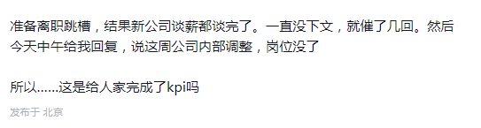 有一位网友就分享了自己的真实经历:准备离职跳槽,结果新公司谈薪20%涨幅都谈完了。一直没下文,就催了几回。然后今天中午给我回复,说这周公司内部调整,岗位没了
