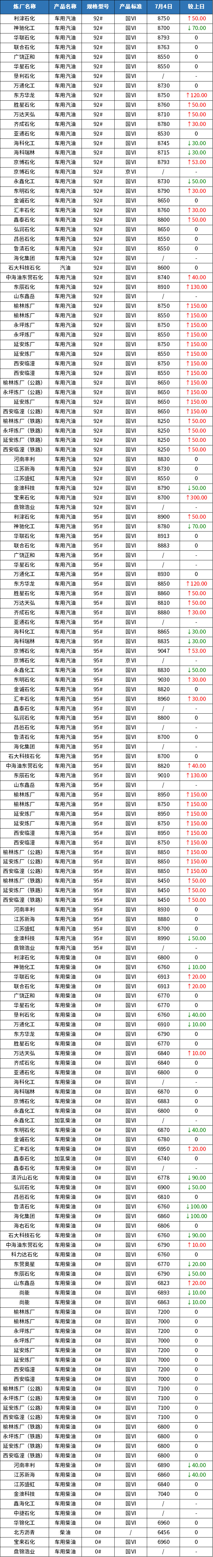 据金联创测算,截至7月5日第五个工作日,参考原油品种均价为72.77美元/桶,变化率为0.53%,对应的国内汽柴油零售价应上调40元/吨。